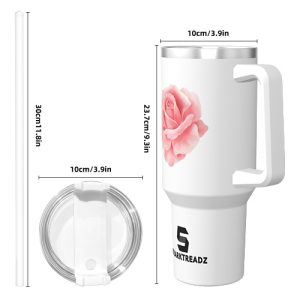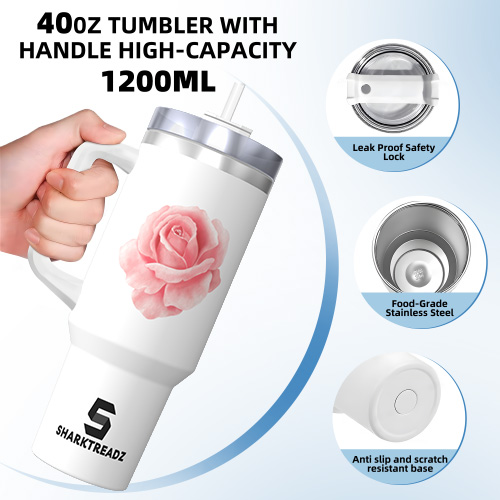 This 40oz stainless steel thermos is an ideal choice for travel, sports and fitness, and daily use, combining efficient heat preservation and elegant design. The bottle is fresh and pure white, and the sides are decorated with exquisite floral patterns, highlighting the beauty of nature and elegance. The unique handle design is easy to carry, making it a perfect companion for people who pay attention to quality and taste.